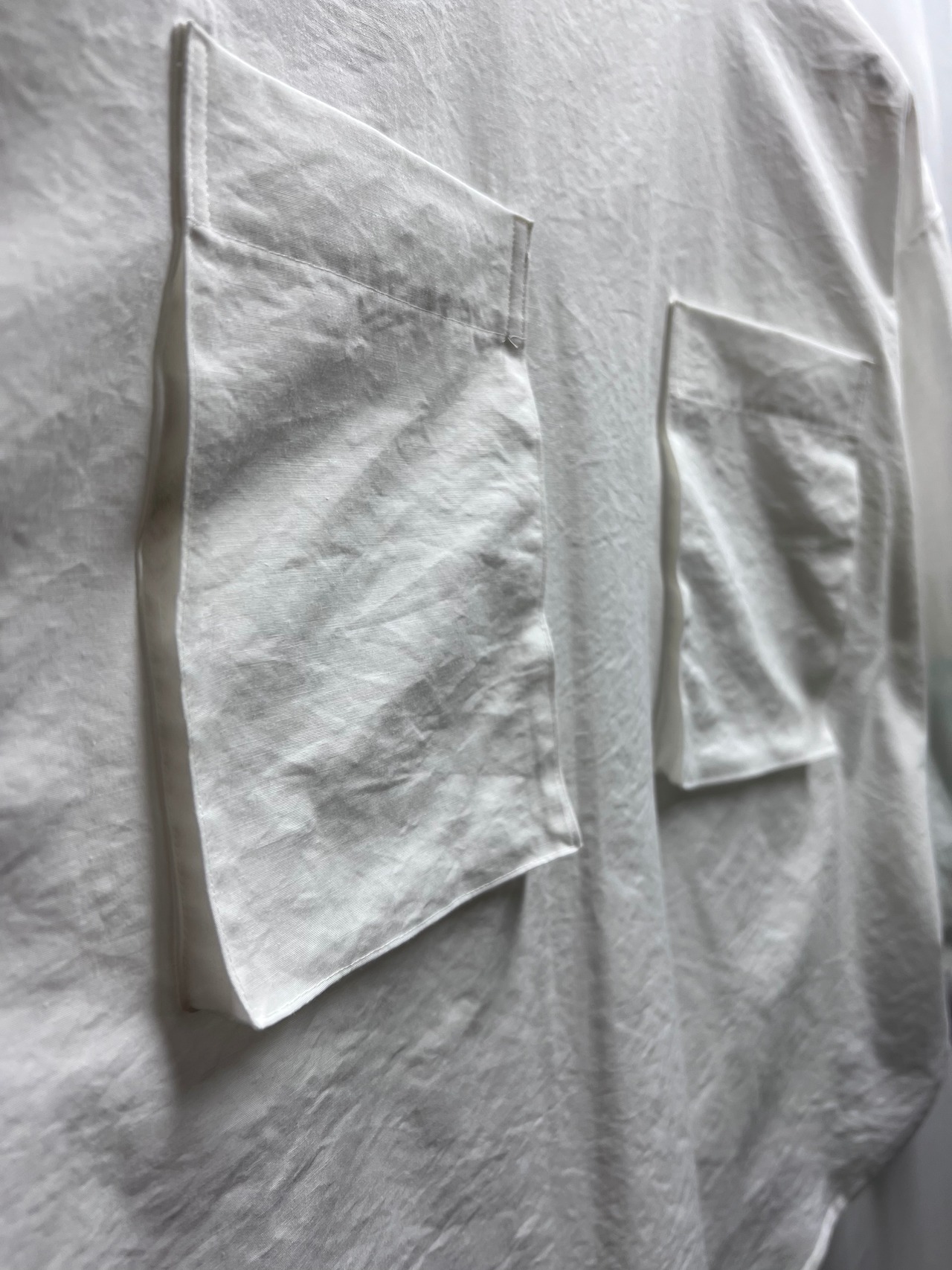 ナイロン混の素材でお作りした大きな胸ポケットが特徴的なシャツです。