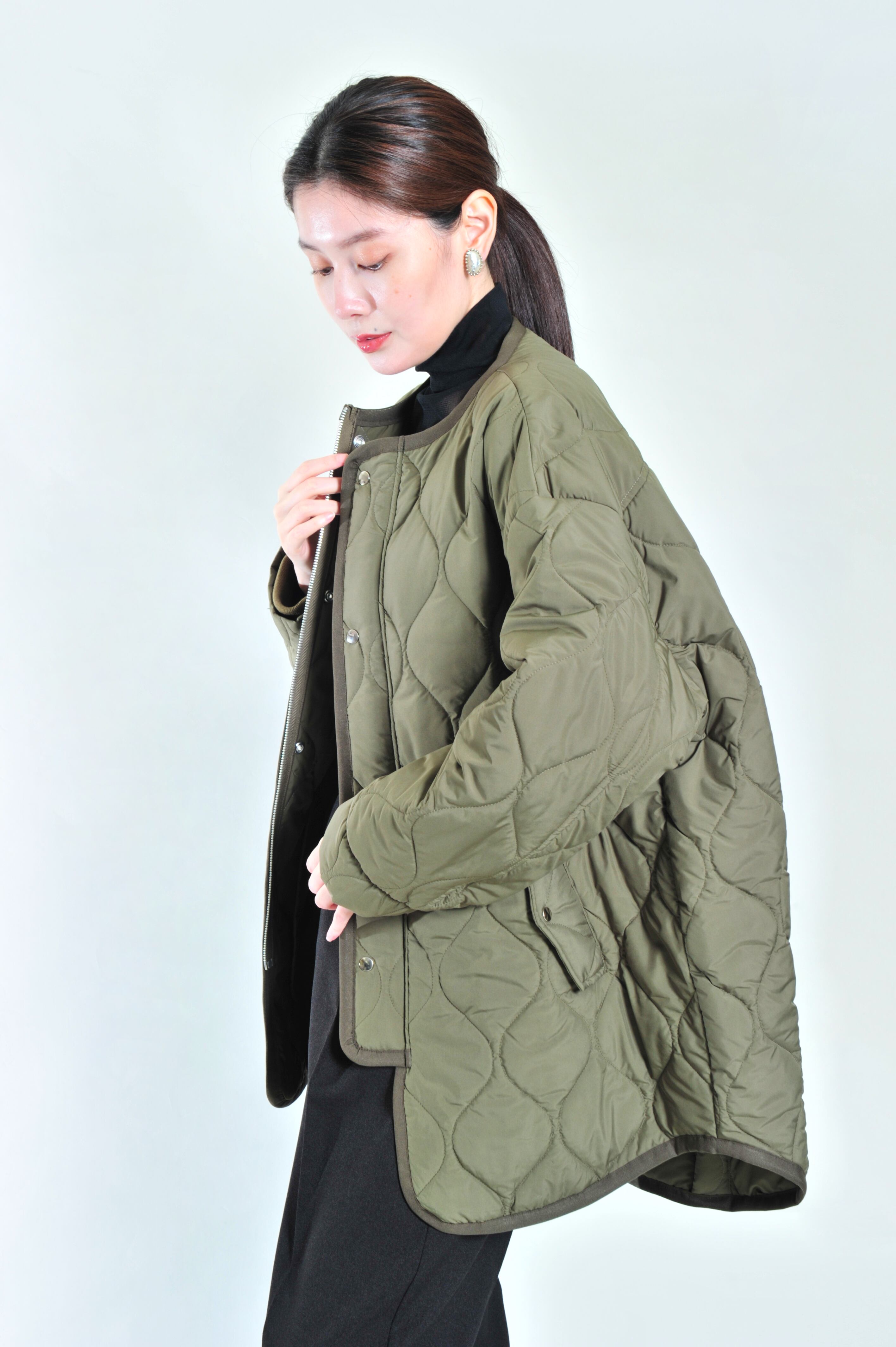 キルティングコクーンハーフコートは、トレンド感たっぷりのデザインが特徴のおすすめアイテム。ふんわりとしたコクーンシルエットが女性らしさを引き立て、ひょうたん柄がおしゃれなアクセントに。ワイドなシルエットとドロップショルダーのデザインで、ゆったりとした着心地が魅力です。